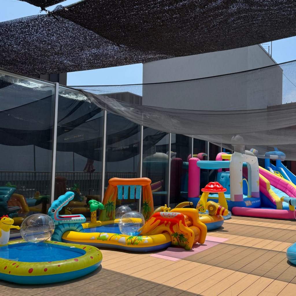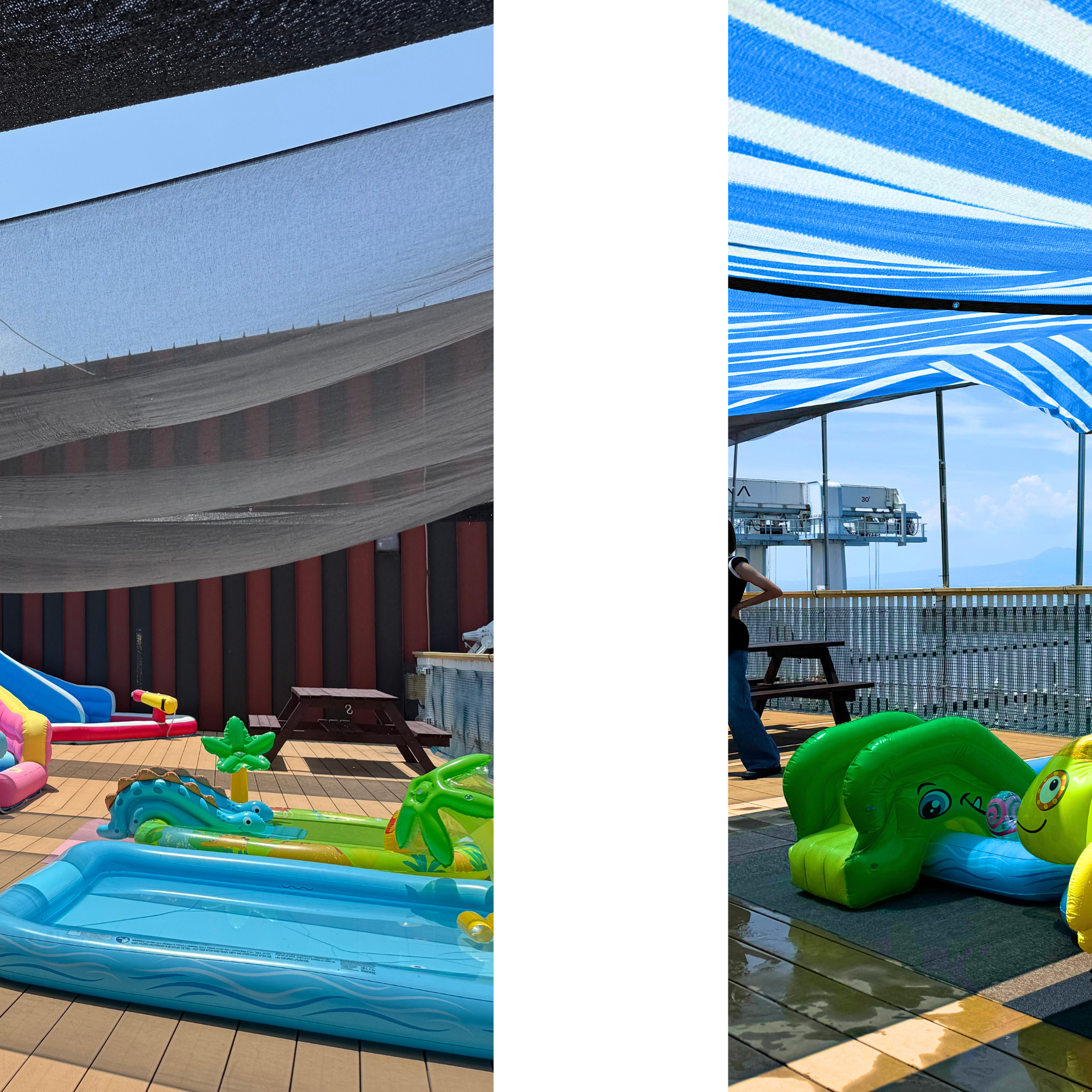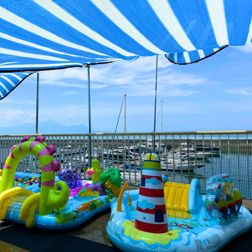 ゲントスカフェの海辺テラスに、子どもたちが思いっきり遊べるキッズプールが今年も登場!大きいプールから小さいプールまで盛りだくさんっ。マリーナを眺めながら、青い空の下で笑顔あふれる夏の思い出を。ご家族でゆったり楽しめる、この時期だけの特別なプールイベントです。