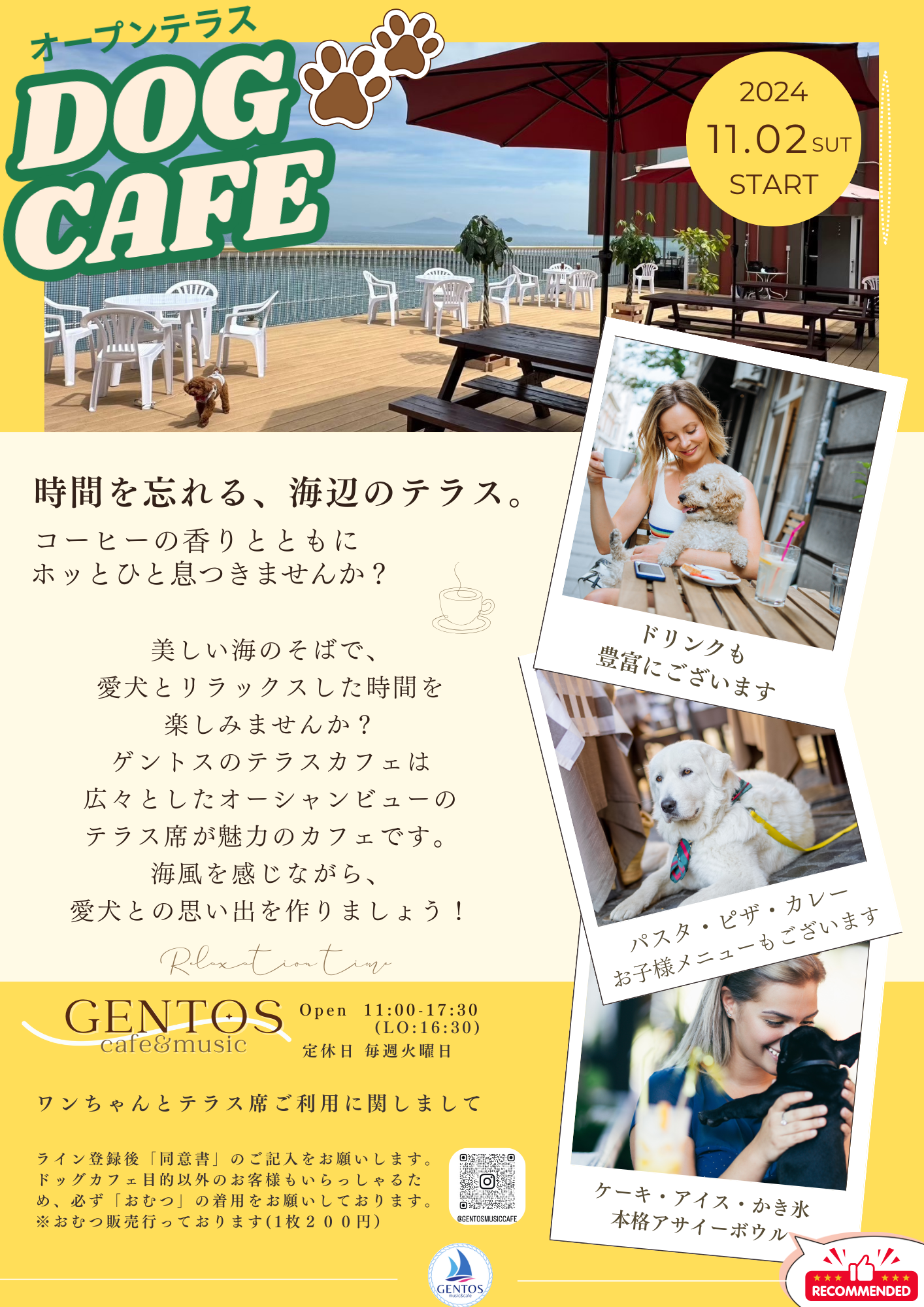 春・秋の過ごしやすいシーズンに、GENTOSの海辺テラスで「DOG CAFE」を今年も開催予定。愛犬と一緒にゆったり過ごせる特別なカフェ空間をご用意します。期間中は毎週土曜日に「LOVE DOG イベント」を開催し、ワンちゃんも楽しめる特別メニューや交流の時間をお楽しみいただけます。