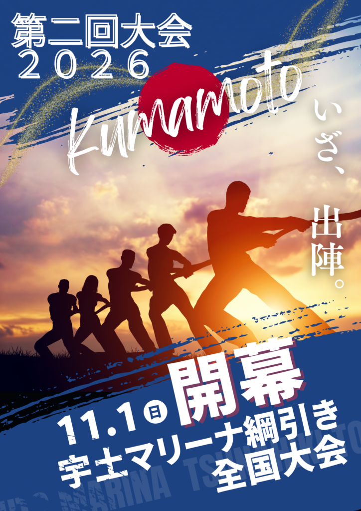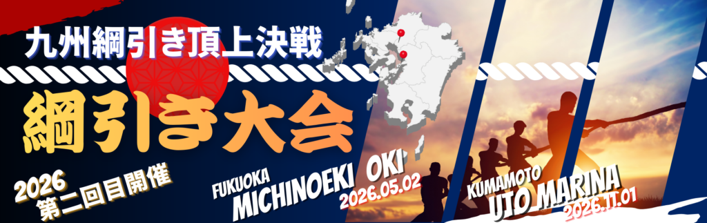 今年、第2回綱引き大会を開催します。昨年は宇土マリーナ綱引き大会として実施しましたが、今年は規模を拡大し、九州綱引き頂上決戦として開催します。5月2日に福岡県「道の駅おおき」にて予選大会、11月1日に熊本・宇土マリーナでも予選大会を実施し、各大会の優勝チームが決勝戦で激突します。九州はもちろん全国からの参加者を募集しています。